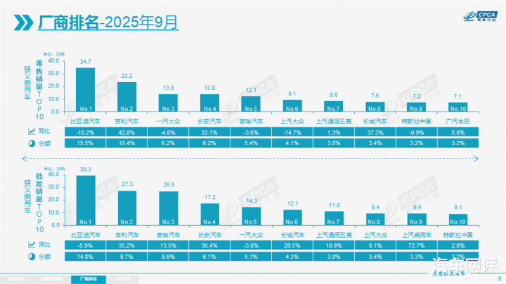 此外,从库存角度看,9月厂商主动增加库存7万辆,与去年同期去库存12万辆形成鲜明对比。这一方面说明企业对后市预期趋于乐观,另一方面也反映出供应链和排产计划更加稳健。在经历了前几个月的波动之后,车企正在逐步找回生产和销售之间的平衡。