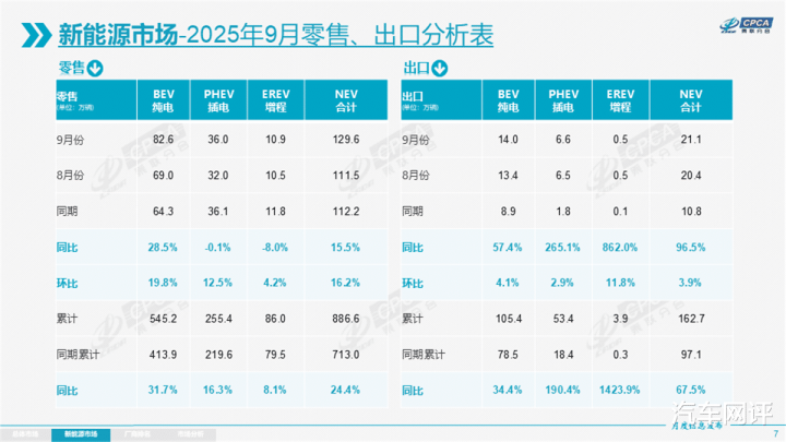 在各类车型中,新能源车依然是拉动市场增长的重要引擎。9月,新能源车零售达到129.6万辆,同比增长15.5%,渗透率进一步提升至57.8%,也就是说,每卖出两辆车,就有一辆以上是新能源车。这一比例不仅体现出消费者对电动化产品的接受度持续提高,也说明在政策引导与技术成熟的双重推动下,新能源车已真正成为市场主流。