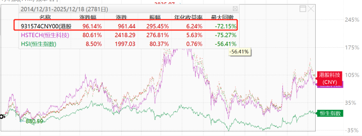 覆盖“中国十大科技股”(阿里巴巴、京东集团、吉利汽车、比亚迪股份、小米集团、腾讯控股、网易、百度集团、美团和中芯国际)的港股科技指数(931574)相对恒生科技指数表现更优。港股科技指数(CNY)自基日2014年12月31日至2025年12月15日,累计涨幅96.14%,同期恒生科技指数涨幅80.61%。